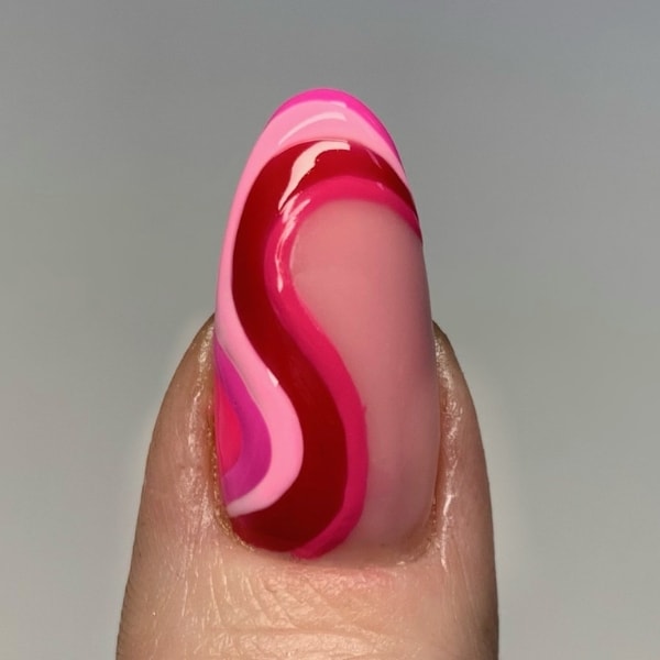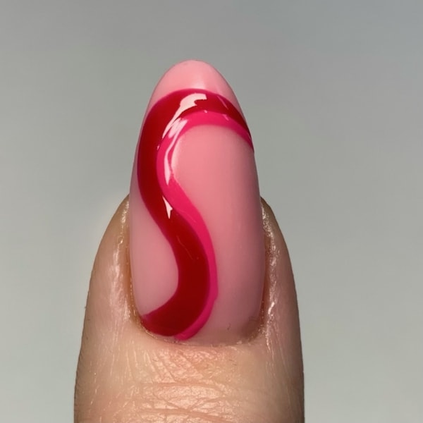 For the second swirl, take a thinner liner art brush and apply a hot pink gel polish shade, making the swirls different thicknesses.