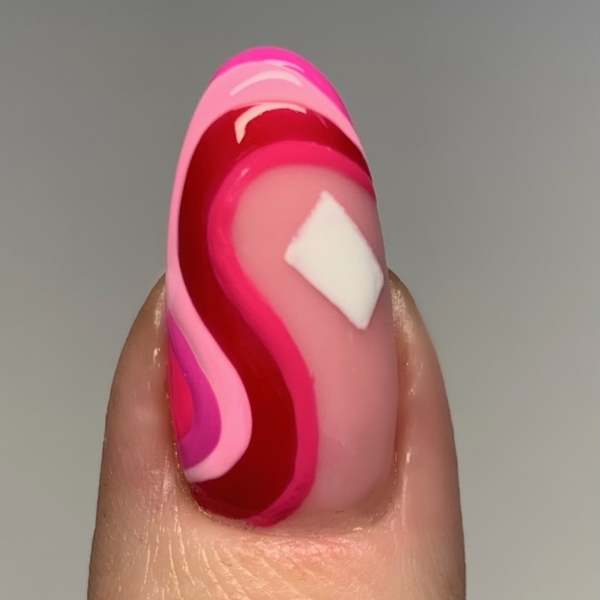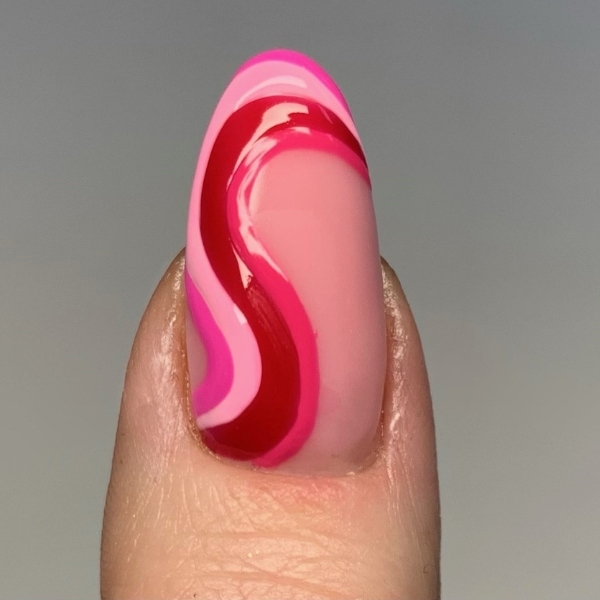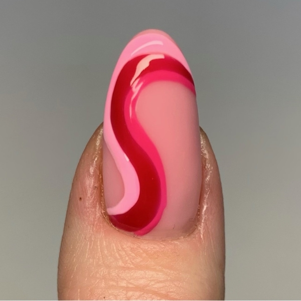 For the third swirl, following the same shape, use a lighter pink gel polish. Cure.