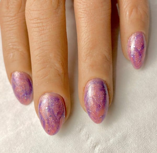 Next, apply a few drops of Gellux in Unicorn and Gellux in Lilac Love and marble them together using a thin nail art brush, before curing for 30 seconds.