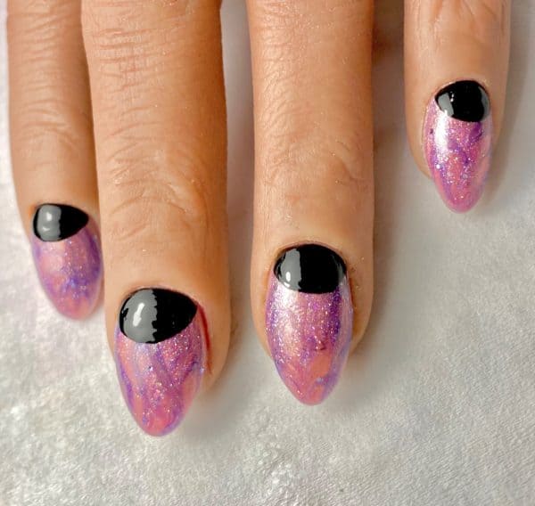 Using a nail art brush dipped in Gellux in Black Onyx, create black half-moons on each nail, then cure for 60 seconds. Apply a second coat of Gellux in Black Onyx if necessary and cure again.