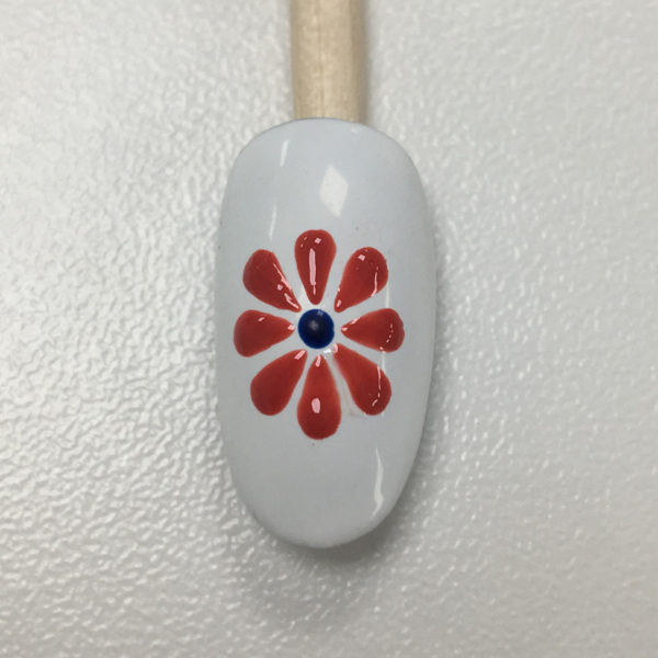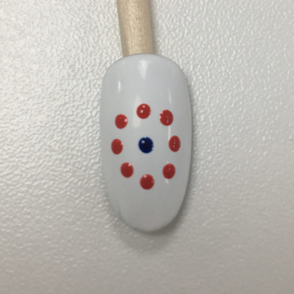 Over a white base, use a dotting tool to map out the centre of your flower and the tips of your petals to make sure everything fits on the nail. Cure.