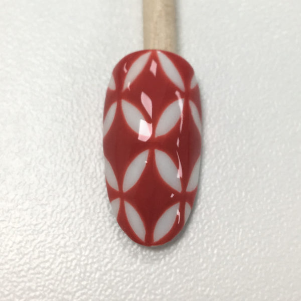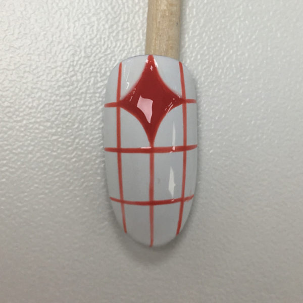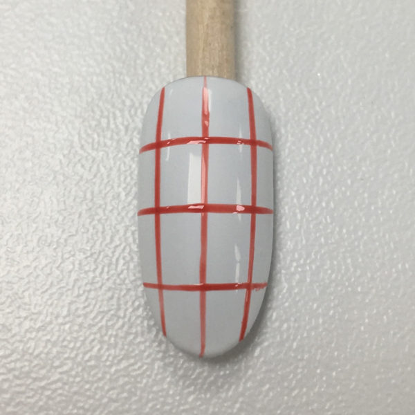 On the next nail, start with a white base. Map out a grid with your Lecenté striper brush in S1. This will help keep the proportions of your repeat pattern even. Cure.