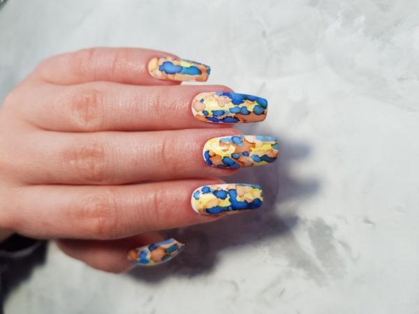 “Alcohol inks are very popular at the moment!” reveals Anastasiia Morozova. “I love this style of nail art, I think it afford such an interesting effect. Don’t be surprise if your client will love the result even without blending the colours!”