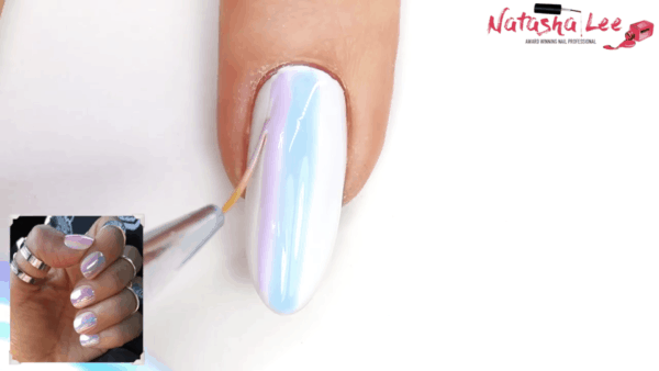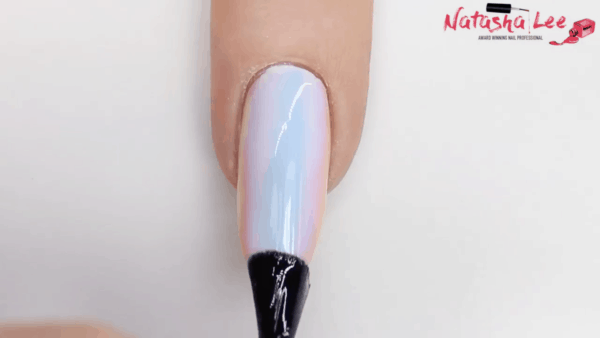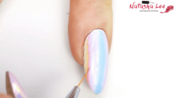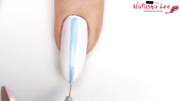 Select a variety of pastel gel polish shades and apply a pale blue hue down the centre of the nail in a thick line using a tripping brush. Do not cure.