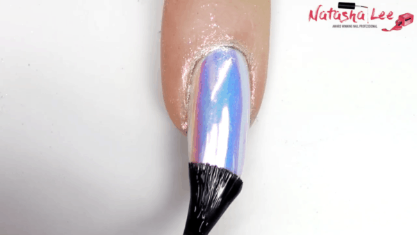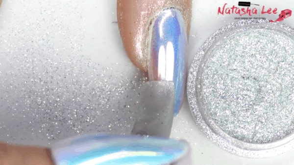 Using a flat edged silicone tool, firmly rub a unicorn-style dust or pigment onto each nail. Continue until the whole nail is covered and has a mirror shine.