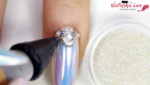Place chrome shells, crystals, pearls and iridescent caviar beads into the gel. Cure and remove the sticky layer.