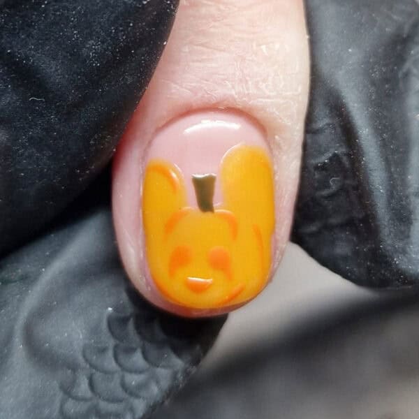 Using a deeper orange gel hue, paint shading and facial features onto the pumpkin. I used a mix of Nailchemy Artisan UV/LED Gel Paints in Green and Brown to add a stalk to the top. Cure.