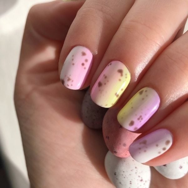 Using GELLUX Wear It Well, and a dotting tool, randomly dot a speckled design all over the nails. You may want to have a mini egg in front of you to copy. Once done, cure or 60 seconds.