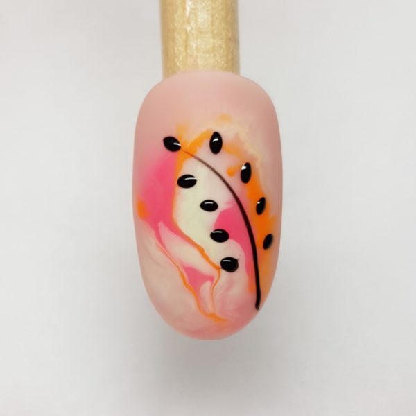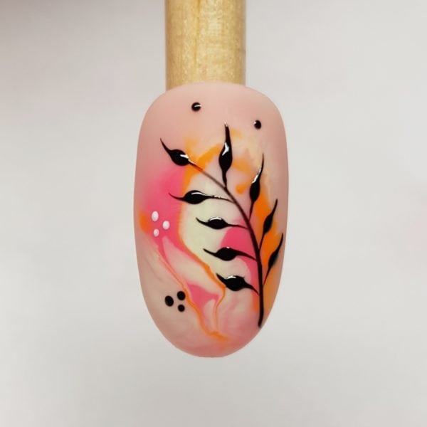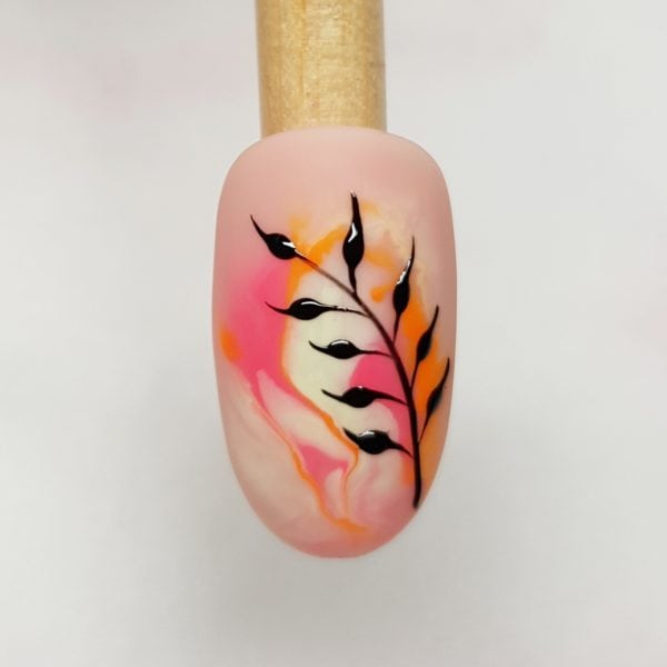 Draw a line from the bottom corner with Ornament Gel in Black. Use a fine long brush like 0 Long. Pick up a good amount of product on the tip of your brush and place the leaves. Don't cure.