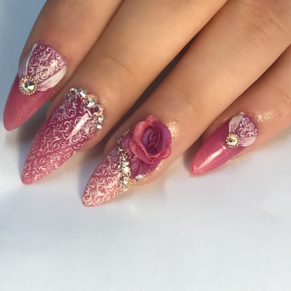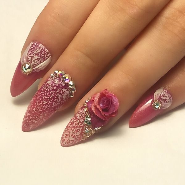 Sculpt an almond nail enhancements using coloured acrylic powders, creating an ombré design from dark to light (cuticle to tip).