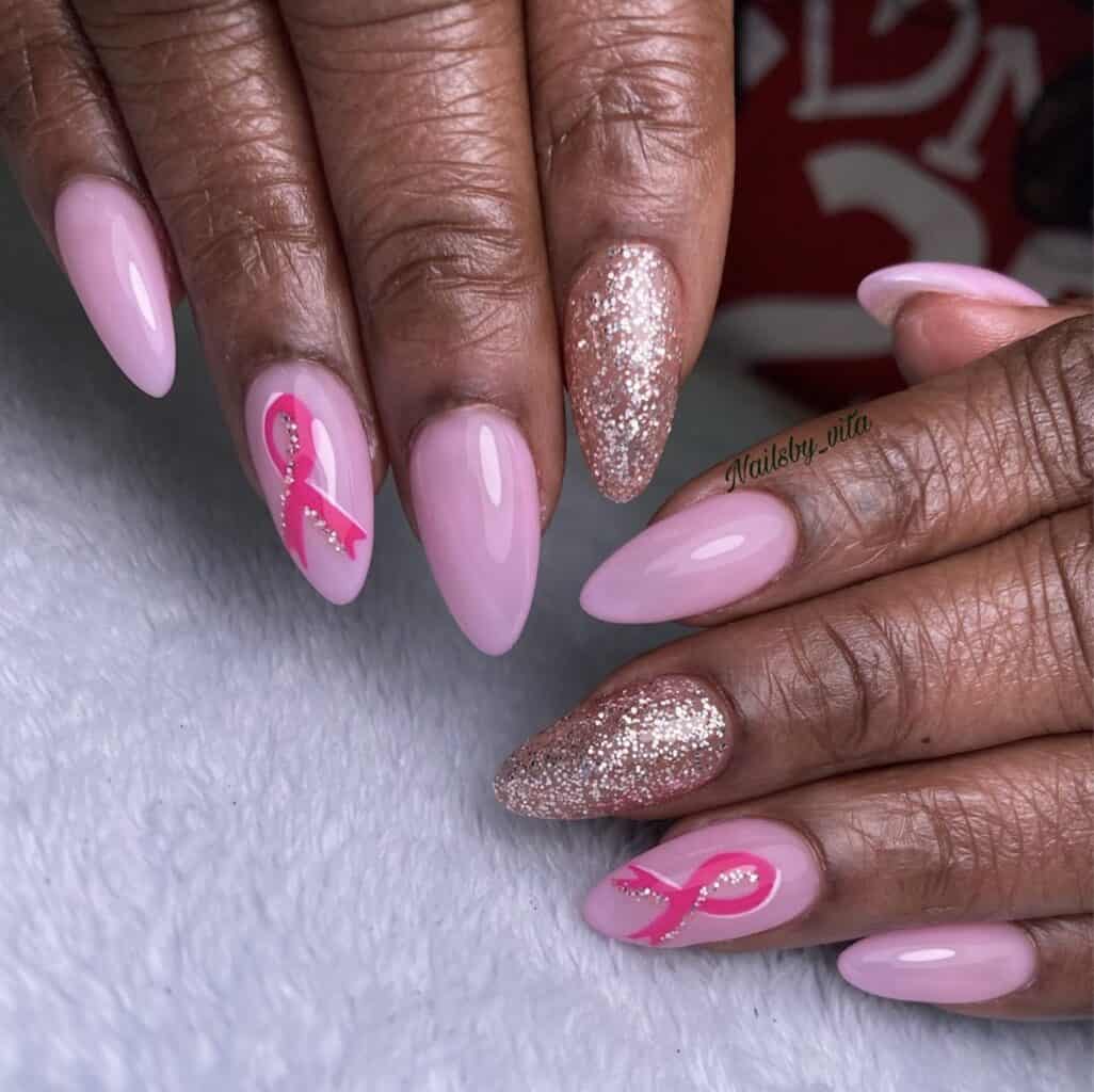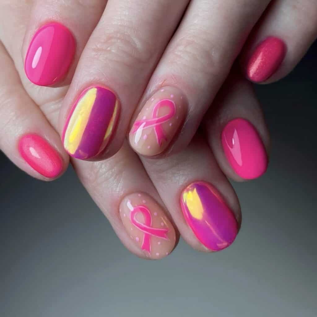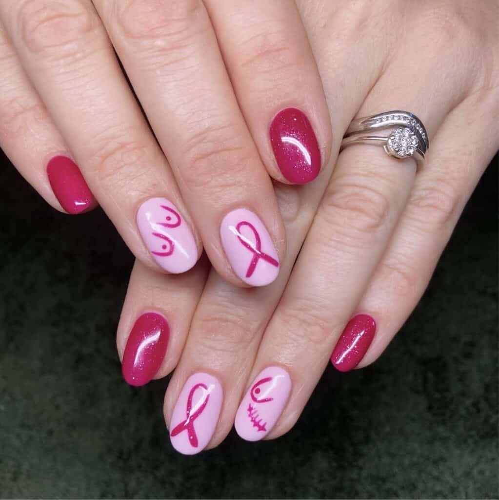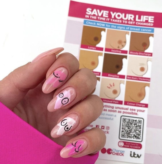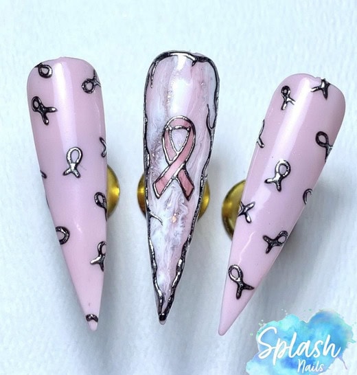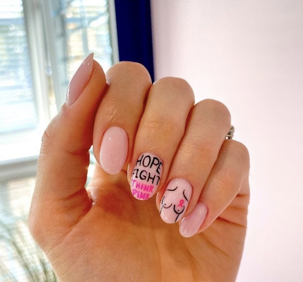 Nail art is one way to show support, and can incorporate a symbolic pink colour scheme and the pink ribbon: the worldwide symbol of breast cancer awareness.