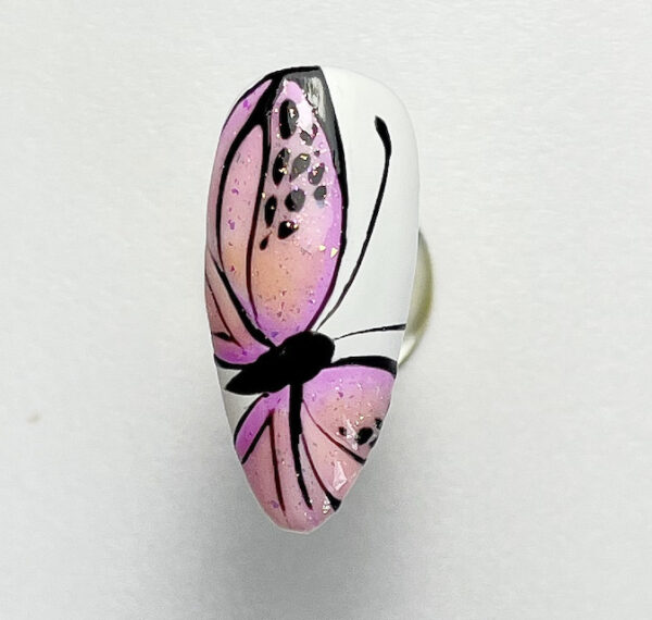 Paint the nail using a white gel polish for the base. Cure. Use a light pink gel polish to create soft, curved shapes resembling butterfly wings.