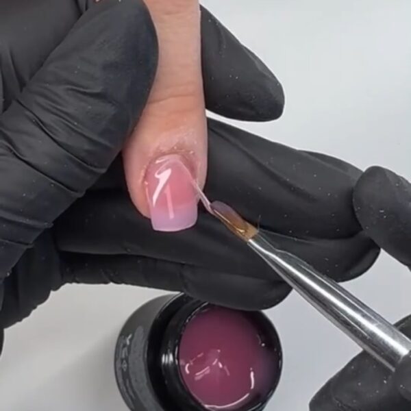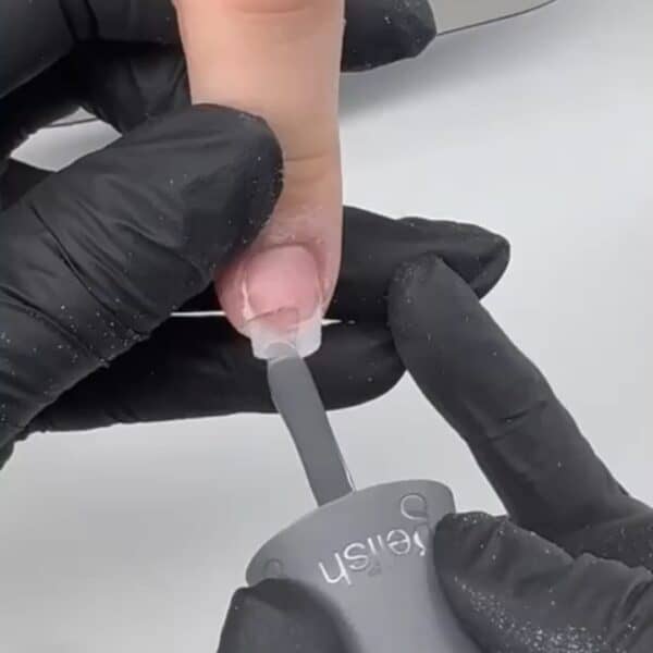 Brush a thin layer of Gelish Hard Gel over the nail, but do not cure. This will help guide the next layer of gel smoothly into place. Apply a bead of Gelish Hard Gel to the centre of the nail, using a square or oval brush. Gently pull it down towards the cuticle, sidewalls and free edge. You can also use the stringing method, allowing the gel to ‘string’ from the brush to the nail in a controlled manner for precise placement. Cure in the Gelish 18g Unplugged Lamp for 30 seconds.