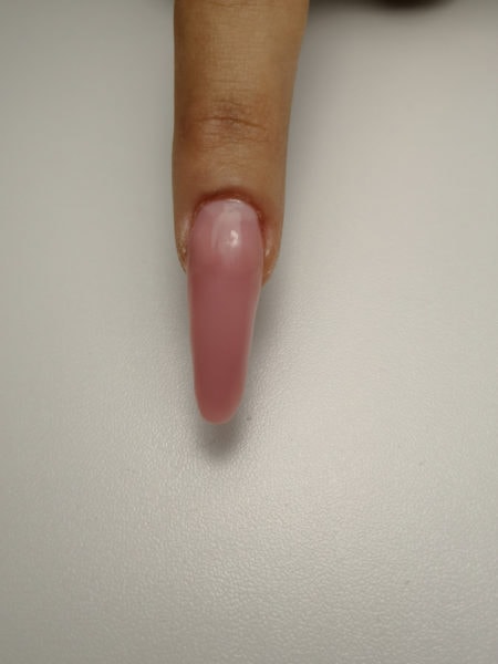 Use Brillbird Cover Pink Future Gel to extend free edge onto the form in a thin layer to create Salon Almond Shape. Cure for five seconds in LED or 10-15sec in UV lamp. Apply a pinching clip to hold the c-curve and cure for 30 seconds in LED or 1-2 min in UV lamp.