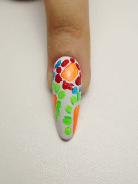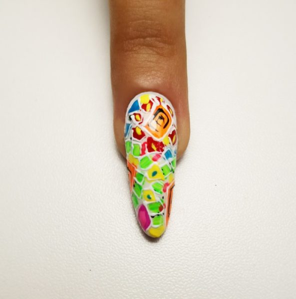 With Brillbird Shadow Gel Brush create any mosaic colour details with Brillbird Designer Gel in yellow, neon orange, red, pink, neon green, black, and any other you would like. Cure in the lamp 2-3 min.