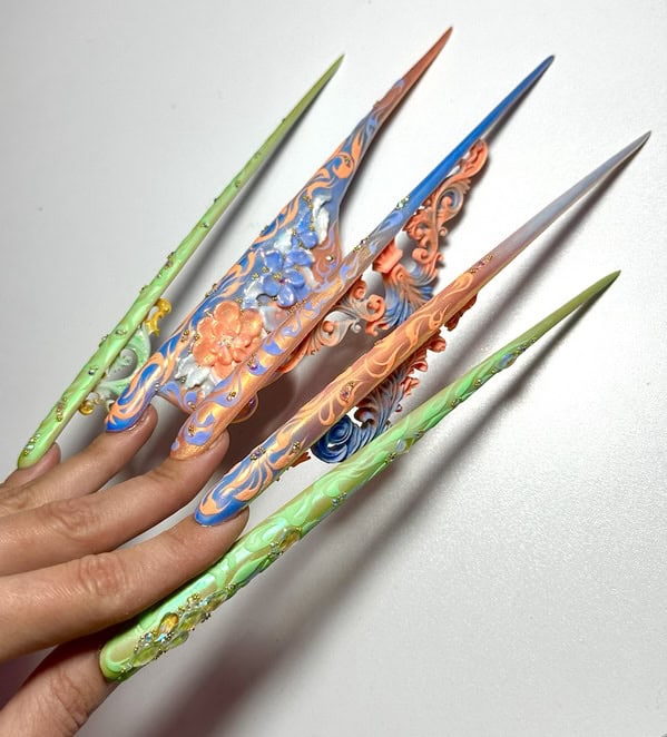 Sponsor brand, LECHAT, tested the structural capabilities and artistry of the 18 remaining contestants, and sent them each a product package to use to create five fantasy-style nails, at least four inches long.