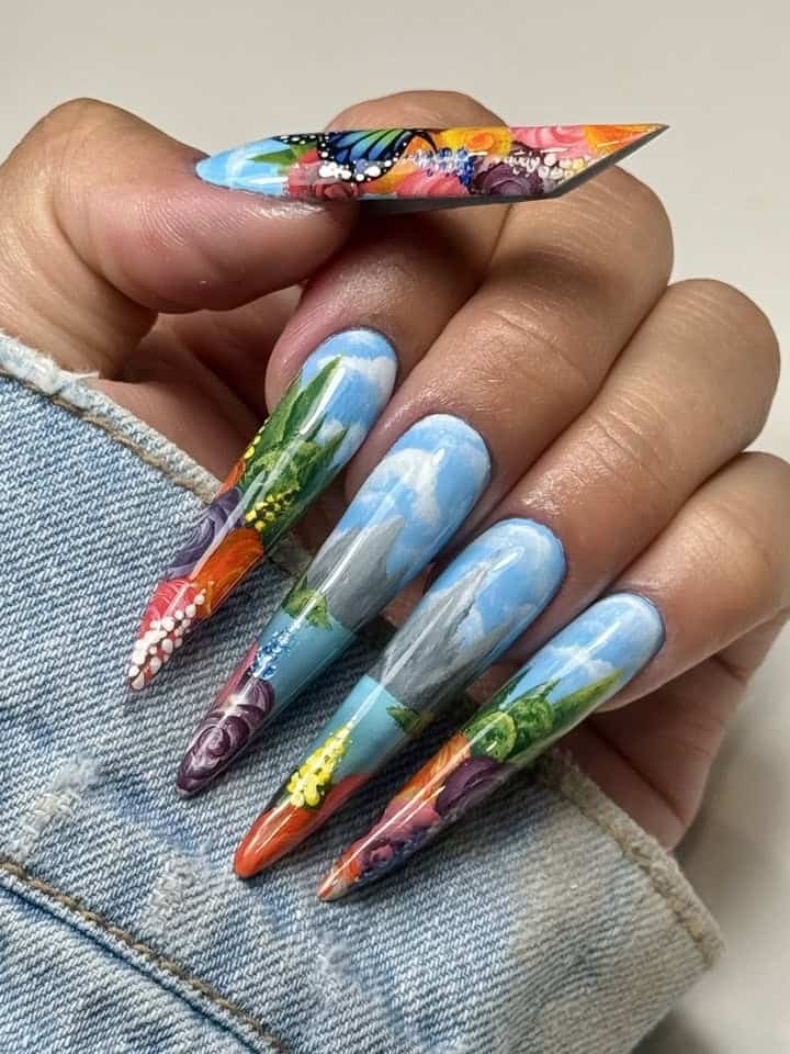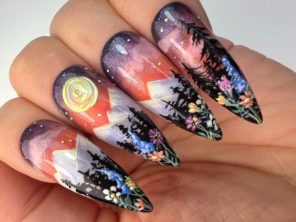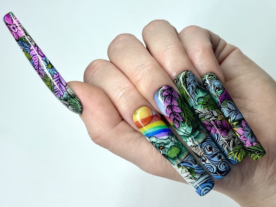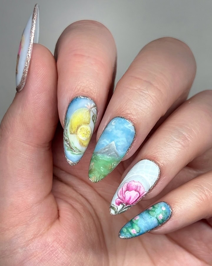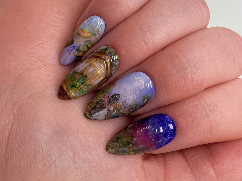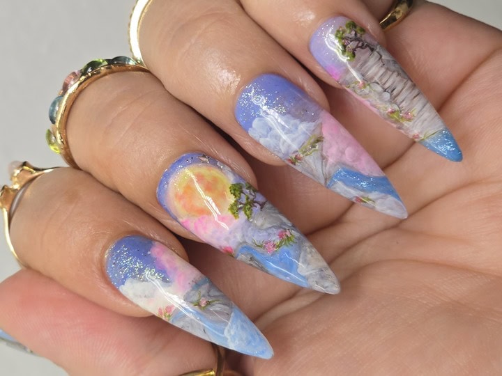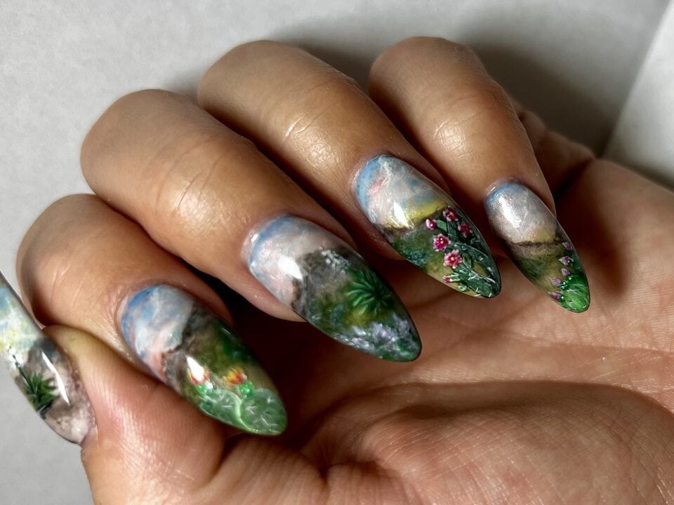 Using Gelish‘s spring 2025 nail colour collection, Now & Zen, as inspiration, create a 2D (flat) nail art design based on the collection theme. ONLY gel polishes, gel paints and acrylic paints were to be used within this challenge (alongside nail art tools such as brushes, sponges or dotting tools).