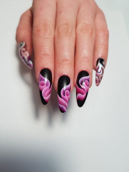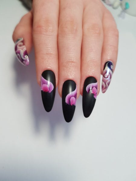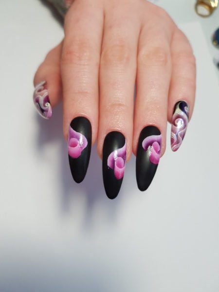 “With spring on the way, a lot of my clients are beginning to request floral nail art designs. The one stroke technique is one of the fastest ways to create beautiful flowers and other artistic details. I hope this tutorial shows you how easy and quick this design can be,” she comments.