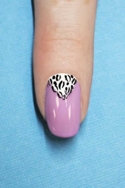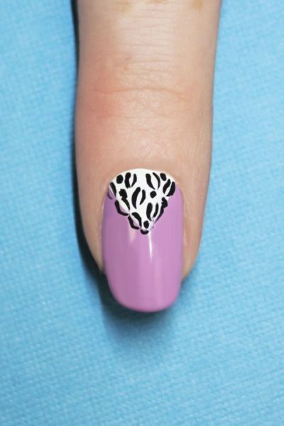 Use a nail art brush with Evo by Bio Sculpture's Black High Pigment Gel to paind a leopard print design over the white triangle. Allow to dry.