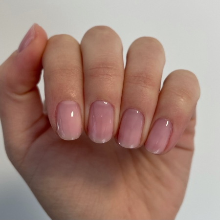 File the nails to shape, push the cuticles back with the GELLUX Cuticle Handy Manicure Tool and gently buff the nail plate with a white block. Cleanse nails with GELLUX Nail + File Cleansing Spray and a lint free pad. When the nails are dry, apply GELLUX Fast Bond and allow to dry for 30 seconds. Apply one very thin layer of the GELLUX Builder Gel in Light Pink, curing for 60 seconds between each coat.