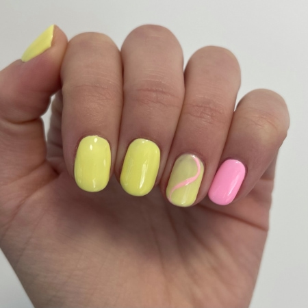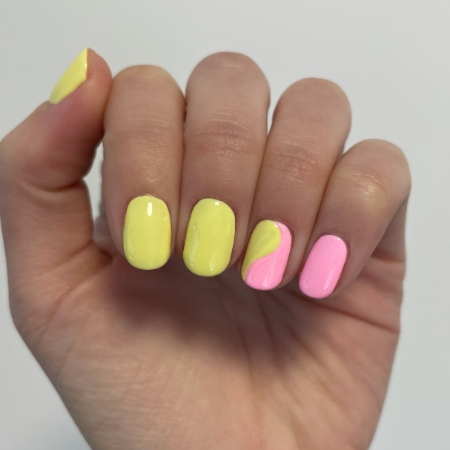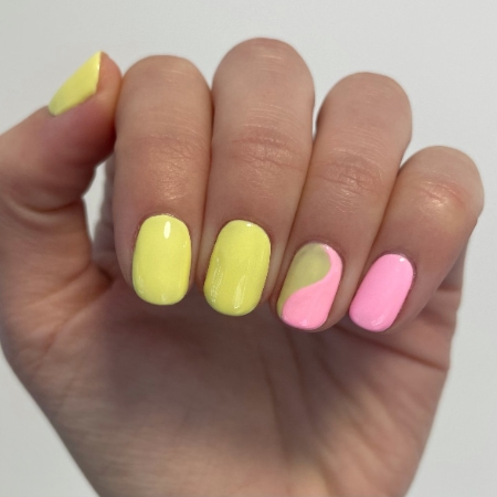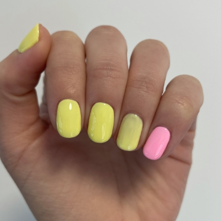Paint two to three coats of GELLUX Wild Style on the little finger and two to three coats of GELLUX It’s An Attitude on the index, thumb and middle fingers, curing between each layer. Paint one coat of yellow on the ring finger and cure.