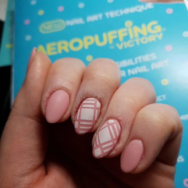 For this design, I have used stencil number CO6. I applied to the stencil onto the middle two nails and using the Aeropuffing tool with the white Aerofuffing Gel paste, I applied the colour onto the stencil. Peel off the nail when complete to reveal the white detail and cure.