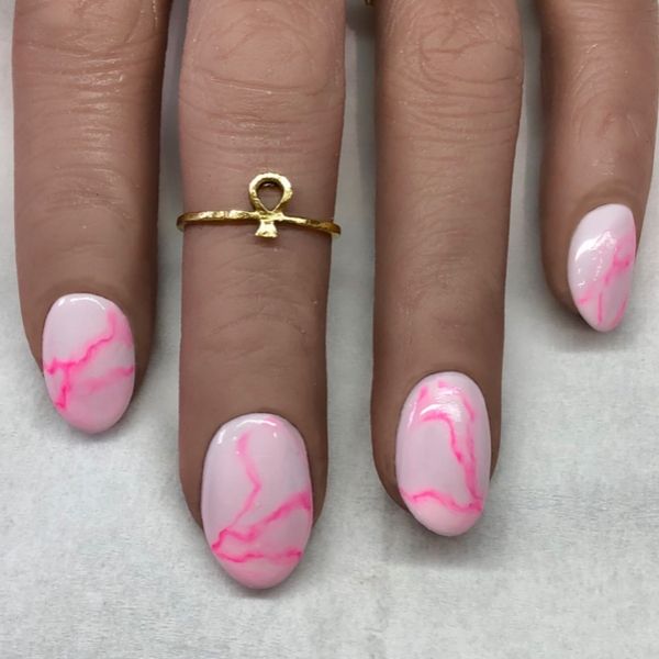Dip the same liner brush into GELLUX Easy Off Base Coat. Gently go over the lines you created using dabbing motions. Leave it to bloom, you can blend these a little more if they haven’t spread enough. Cure.