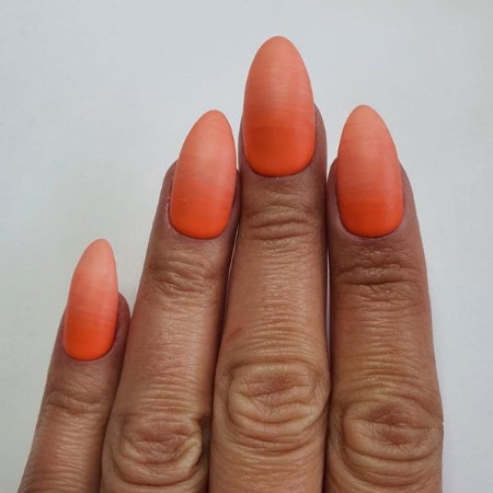 Then go over the nails using the Gellux Black Onyx, trying to stay inside the orange pattern. Finally, apply the Gellux Shiny Top Coat over the design, but make sure you still have the matte effect base as this adds more depth and shine to your design, then cure for 60 seconds.