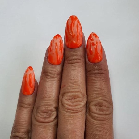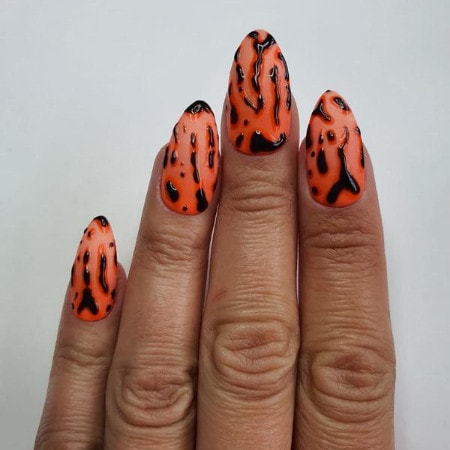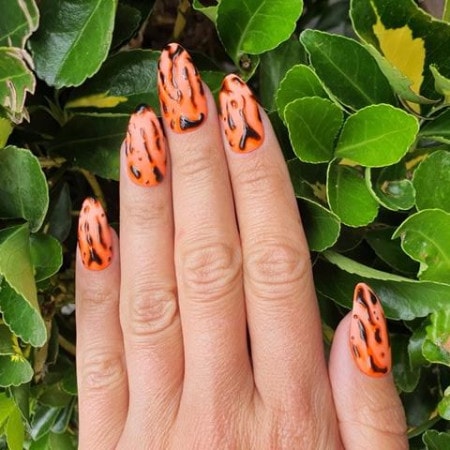 Use a small amount of Gellux Orange Fever on a palette, then with a dotting tool drizzle the colour around the nail to create your design. Make this wide enough to apply the black over the top, but still keep the orange outline, then cure.