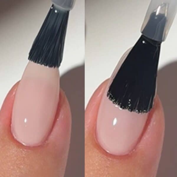Prep the nails. Apply primer then a gel polish base coat and cure. Apply two coats of nude gel polish to all fingers except the ring fingers. Cure.