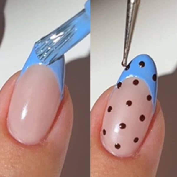 Using a blue gel polish, paint French tips on the index fingers and cure. Then, use brown gel polish and a dotting tool to add dots in a straight line down the middle of the nails. Create two more lines of dots on either side. Cure.