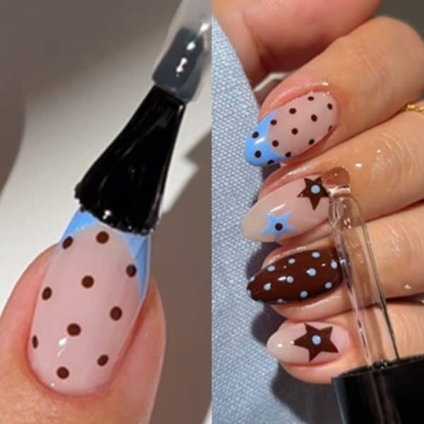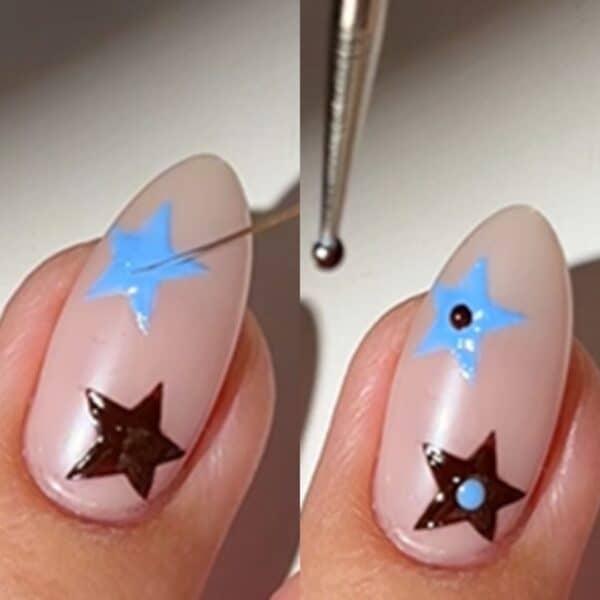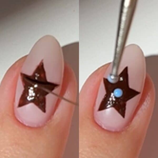 Use a thin nail art brush to paint a star shape in the centre of each pinky fingernail using the brown gel polish. Cure, then use the dotting tool to place a blue gel polish dot in the centre of each star. Cure.