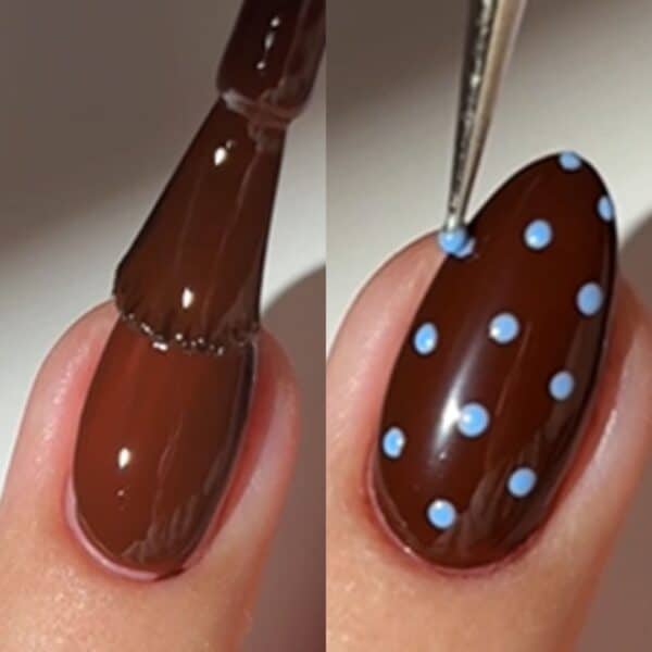 Apply two coats of brown gel polish to the ring fingers, curing between each coat. Use the blue gel polish and dotting tool to add dots in a straight line down the centre of the nails. Create two more lines of dots on either side and cure.