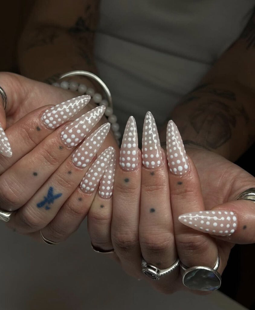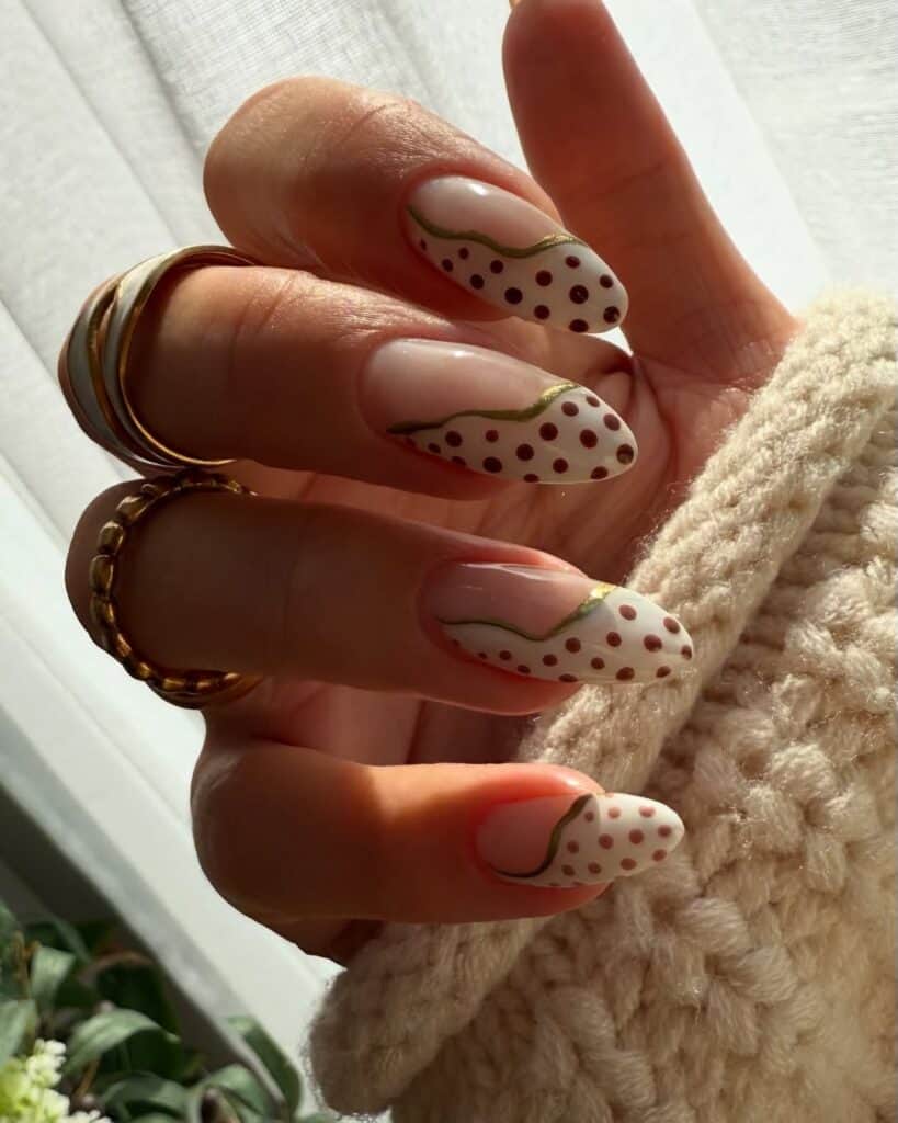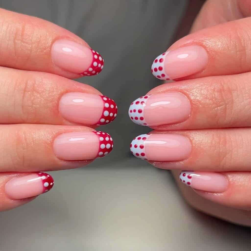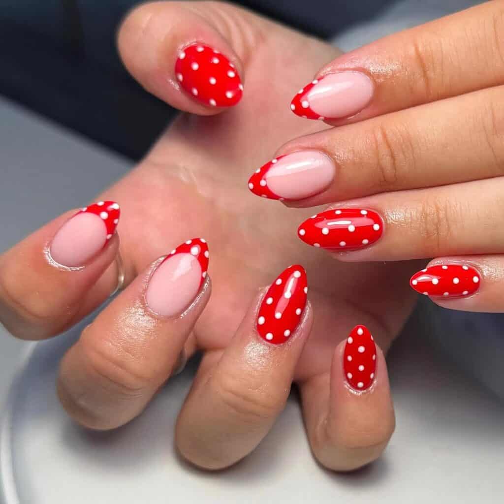 Polka dot patterns have taken over the fashion scene and are now making their way onto nails, adding a playful touch to classic overlays.