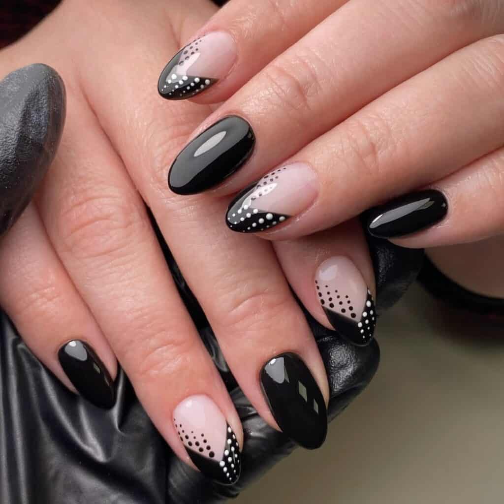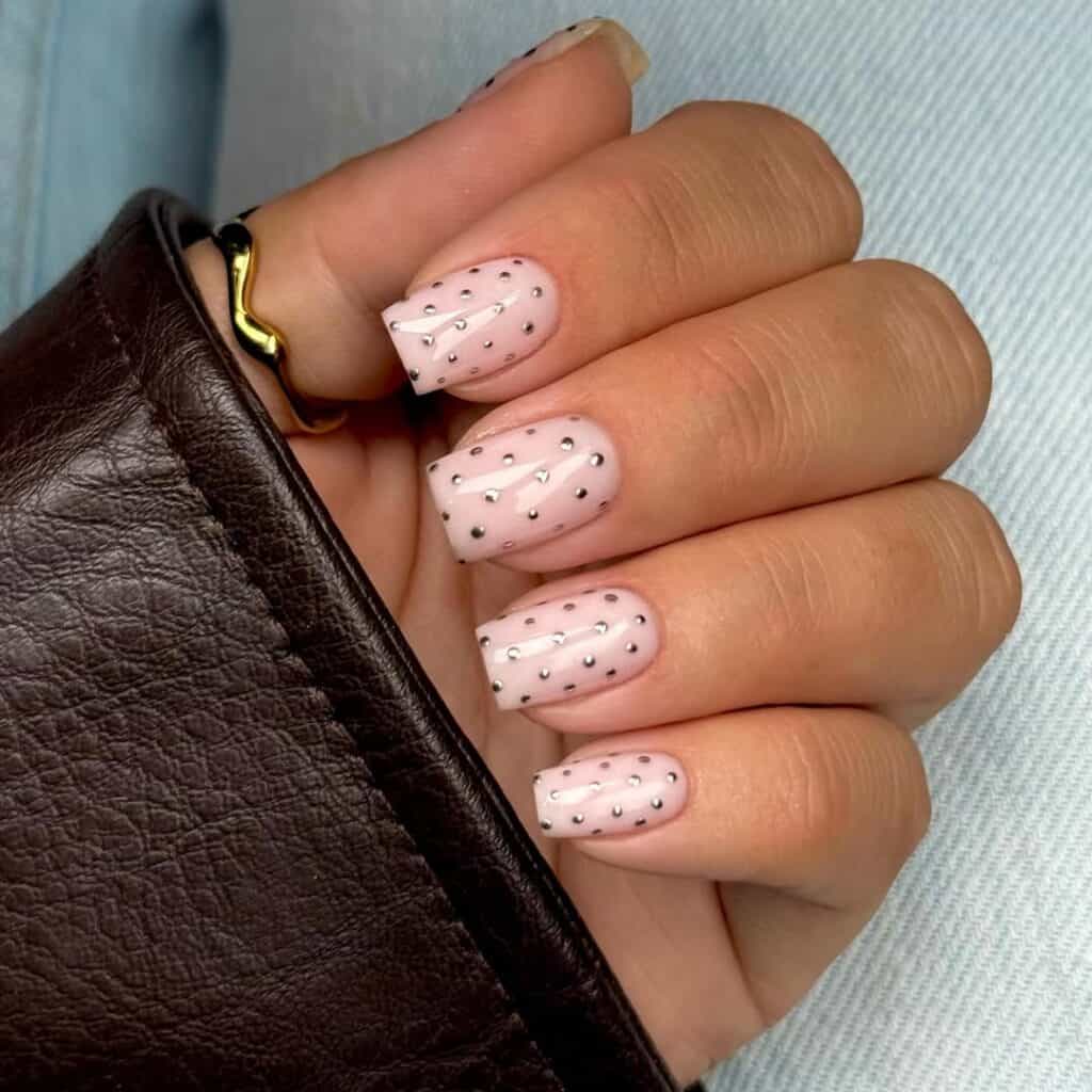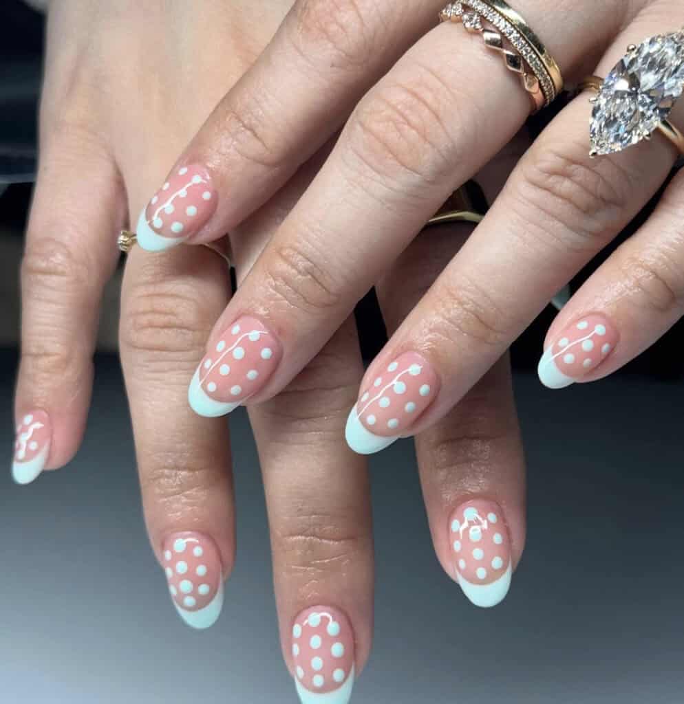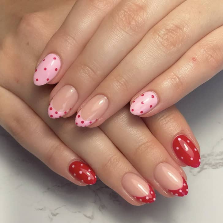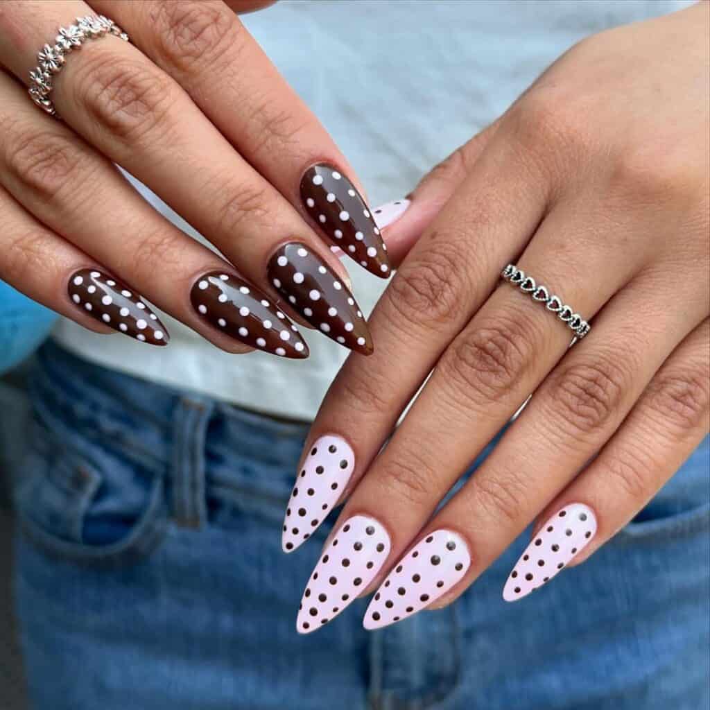 Polka dot patterns have taken over the fashion scene and are now making their way onto nails, adding a playful touch to classic overlays.