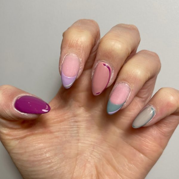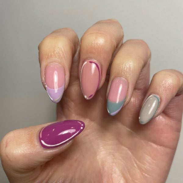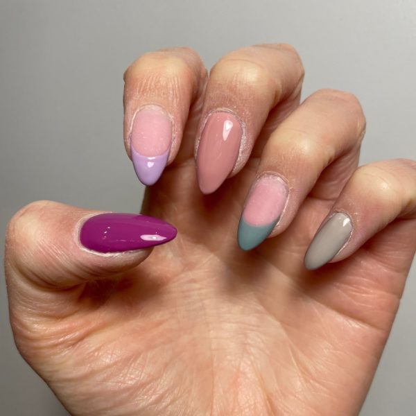 Apply two coats of the following GELLUX Minis: Plumberry to the thumb, Vintage Rose to the middle finger and Absolute Greige to the pinky. Paint two coats of Mini, Dusty Lilac, to the index finger, creating a wide arch shape for a French tip, and repeat on the ring finger with the Mineral Blue Mini. Cure for 60 seconds.