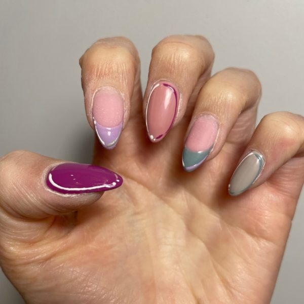 Use a thin liner brush to create a shine effect on each nail, as shown. The following GELLUX Mini shades were used: Vintage Rose on the thumb, Absolute Greige on the index finger, Plumberry on the middle finger, Dusty Lilac on the ring finger and Mineral Blue on the pinky. Cure for 60 seconds.
