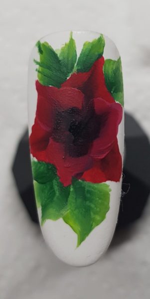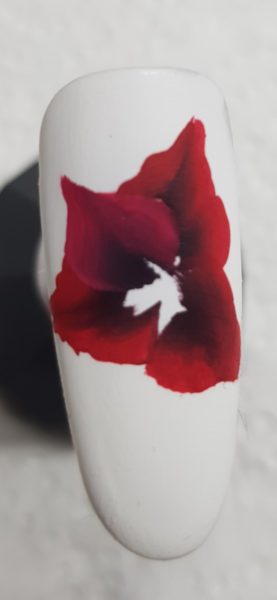 Start by applying two coats of white gel polish. Next apply a matte topcoat ready for your one stroke design.