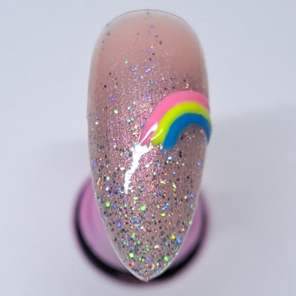 Paint a layer of Glitterbels Hema Free Gel Polish in Pearl's Unicorn over the nail, curing for 60 seconds. Using a Glitterbels Glitter Gel Polish of your choice and an ombré brush, create a glitter fade up the nail, and cure once happy with the application.