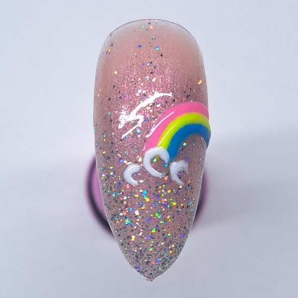 Apply your chosen top coat to the nail. As an optional step, sugar some Glitterbels Fine Loose Glitter in Fairy Dust over the uncured top coat, detailing around the clouds to add extra sparkle. Cure for 60 seconds and dust to finish.