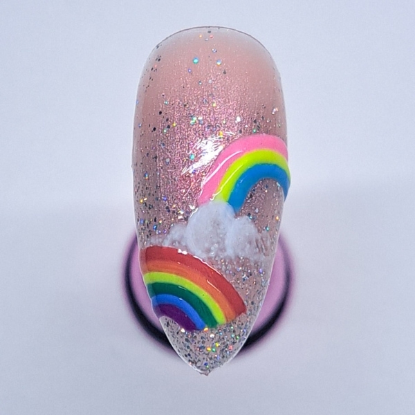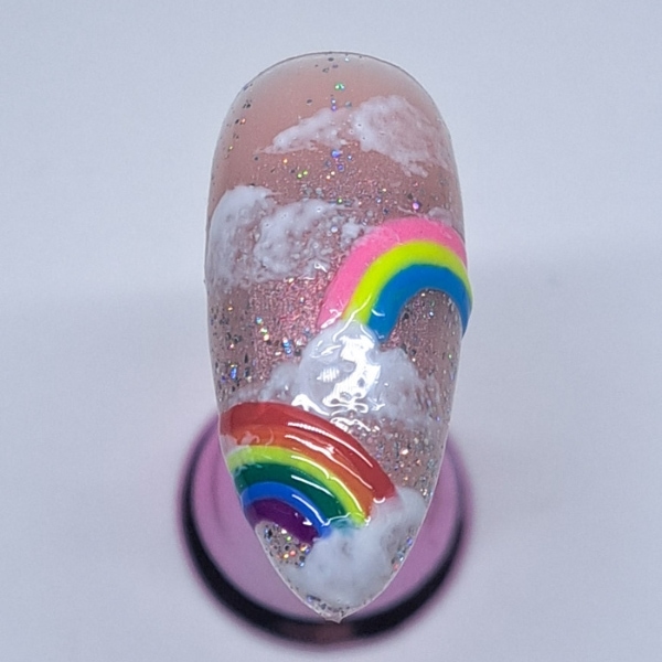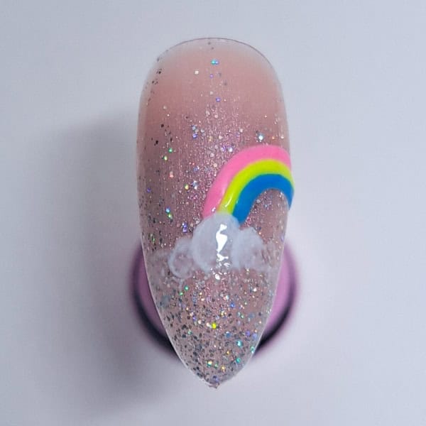Using a small amount of blooming gel or top coat on a fine liner brush, blend out the C shapes until you have created a fluffy cloud at the end of the rainbow. Cure for 60 seconds when happy with the result.