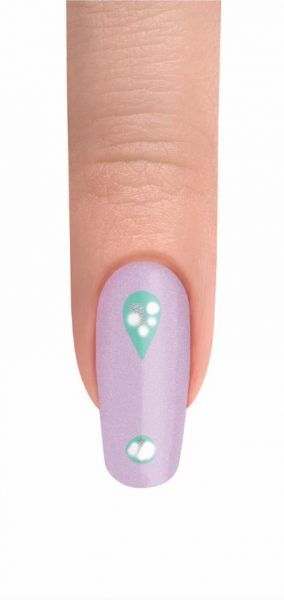 With a mini striper brush and Ruffle Those Feathers, create a tear drop and circle shapes on the nail. Add small dots of My Other Wig is a Tiara and Artice Freeze inside the shapes. Do Not Cure.