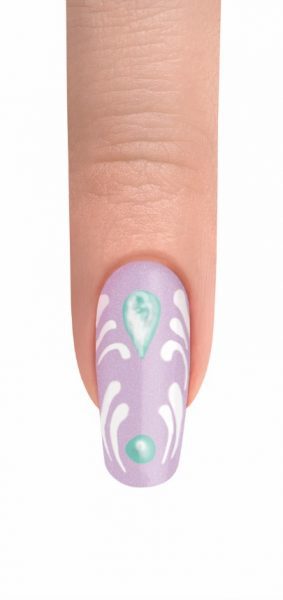 Using a Mini Striper Brush, mix My Other Wig Is A Tiara and Arctic Freeze to create a marble design. With Arctic Freeze and the Mini Striper Brush, paint filigree lines on each side of the nail. Cure for 30 seconds.