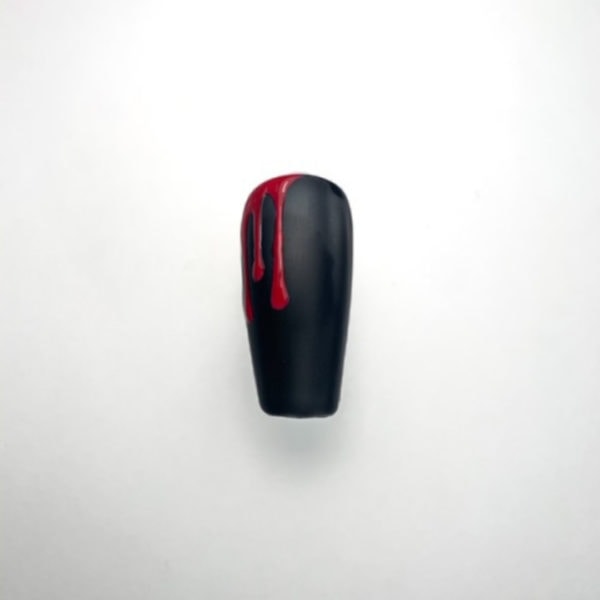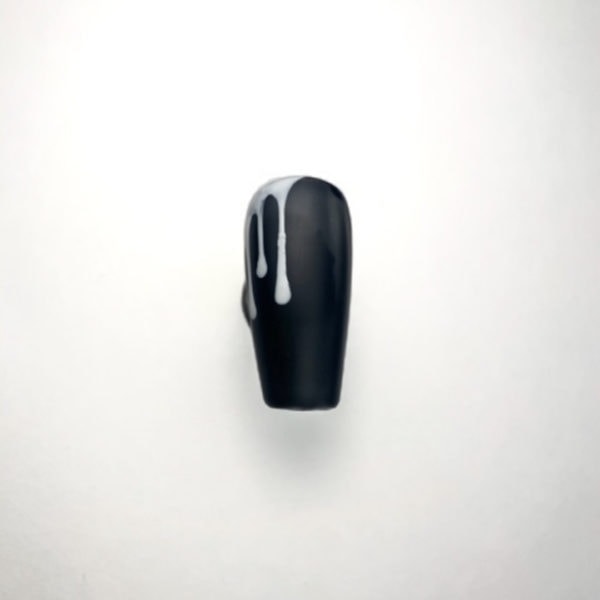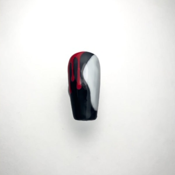Remove the tacky layer. Using Artistic Colour Gloss in Bride and a fine liner brush, paint blood drops from the top of the nail. Cure for 30 seconds.