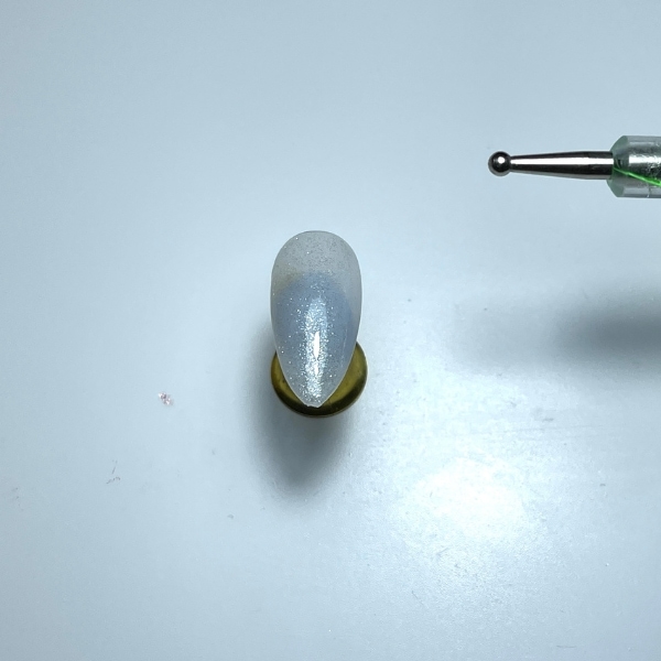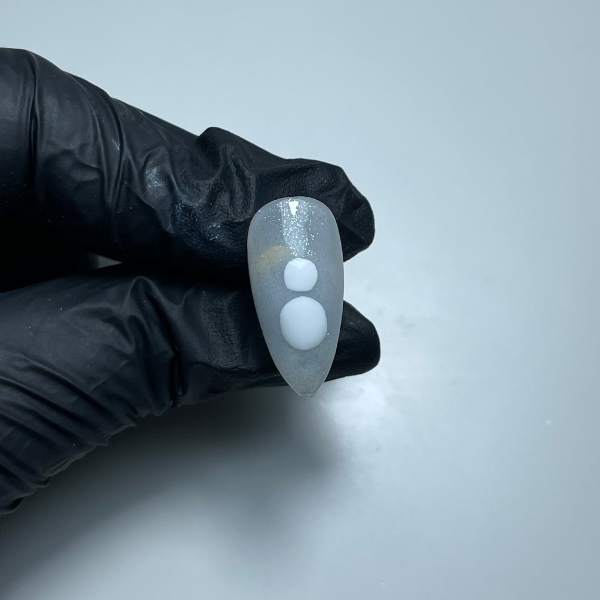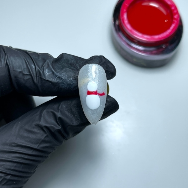 Using the bigger side of a dotting tool, create two dots, with the top one bigger than the bottom, and cure. Try to leave a gap between the dots so we can draw the scarf later.