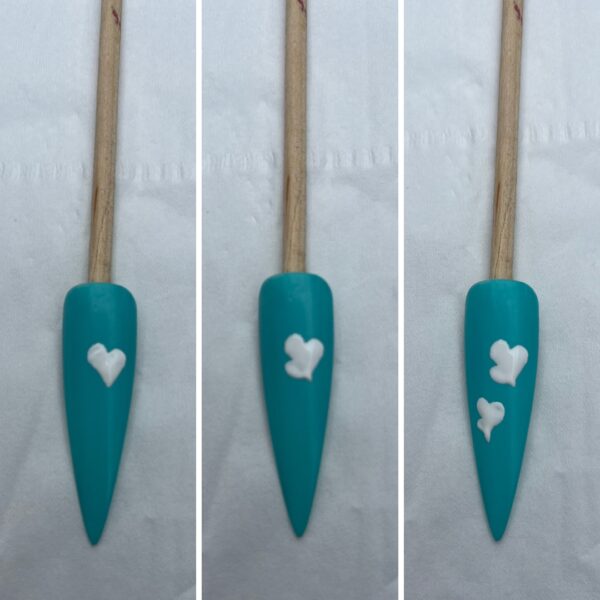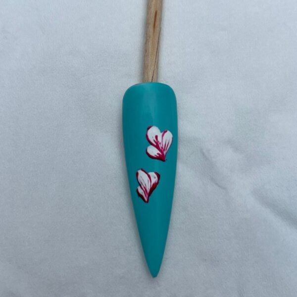 Using a dotting tool or fine brush and a white gel polish, paint a slightly out of proportion heart towards the top right of the nail. Add half of a smaller heart shape on the left of this to create petals. Repeat this entire shape slightly lower down the nail and to the left. If you are concerned about disturbing your first shape, cure it before painting the second. Ensure the white gel polish is fully cured before moving on.