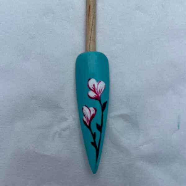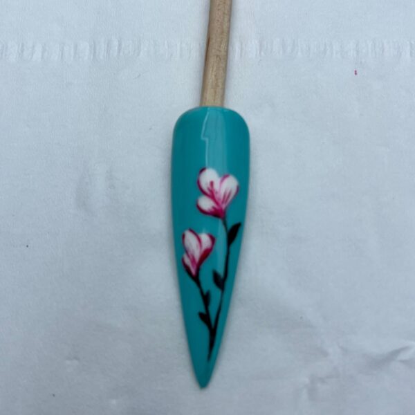 Using a dark gel polish colour and fine detailer brush, paint a V to cup the base of each flower. From each base, paint a line that is slightly bent to create the stems. The two lines/stems should meet at the bottom. Then paint some leaves periodically down the stems. Cure.