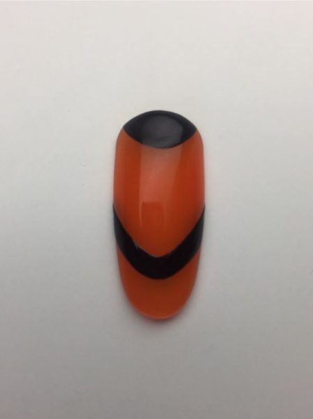 Using a black gel polish and a thin nail art brush, create a half moon shape at the cuticle and a curved, thick line about 1/3rd down the nail from the free edge.