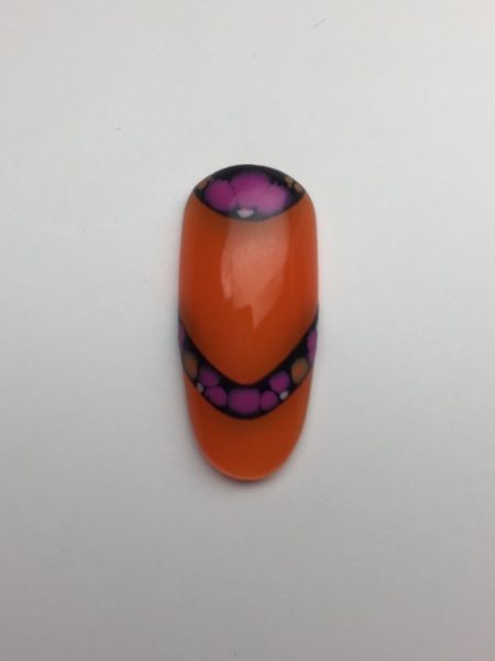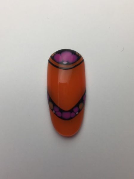 Use a thin nail art brush to create a dotted design along the black areas, alternating the fuchsia Maria Antonina Gel Polish, light pink Olala Gel Polish and orange Kamikaze gel polish. Cure and repeat for a second coat.