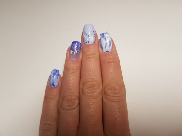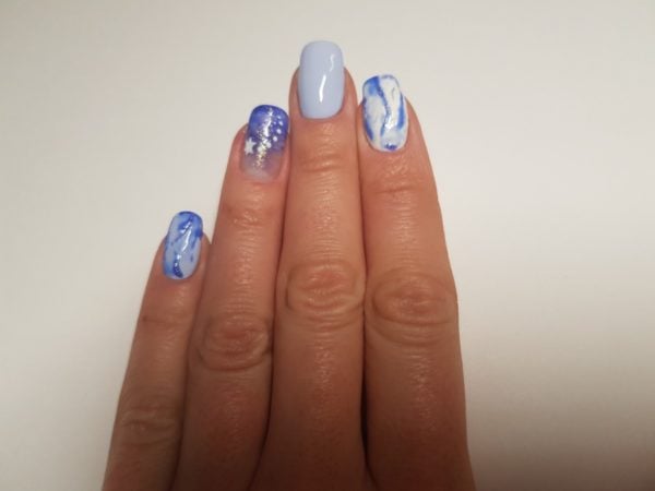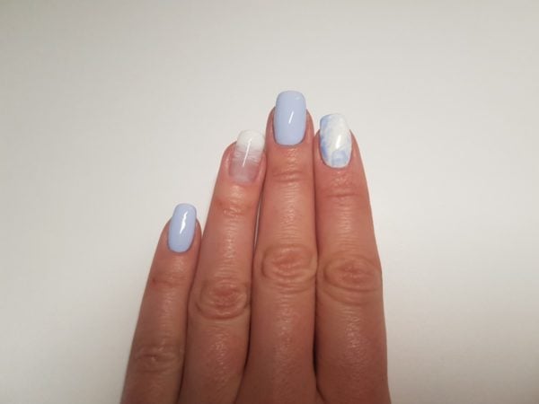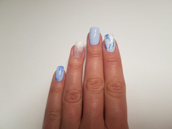 Using a flat nail art brush, dip Gellux Beautiful Barcelona then dap onto your index finger and pinky to get the marble effect. Repeat this with Gellux Stormy over the Index finger. Darken any lines you want to, using a small detailing brush and add small fine lines of Gellux Mini Lilac Love to give it a little sparkle. Cure once you’re happy.